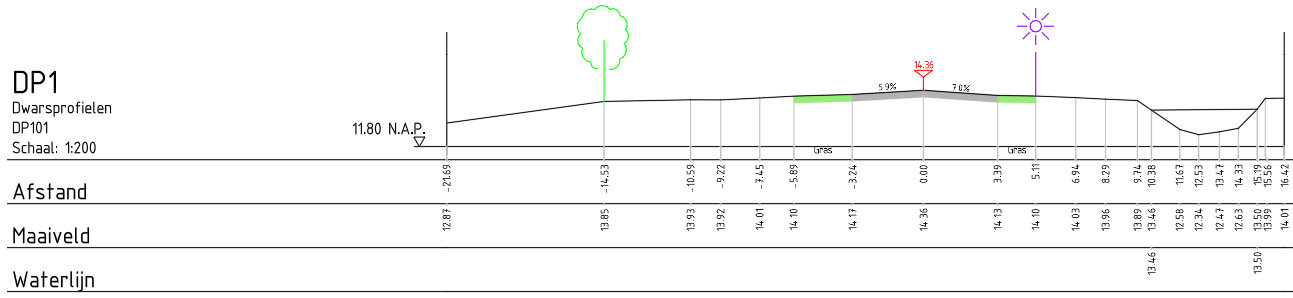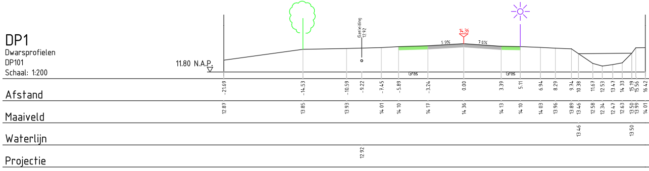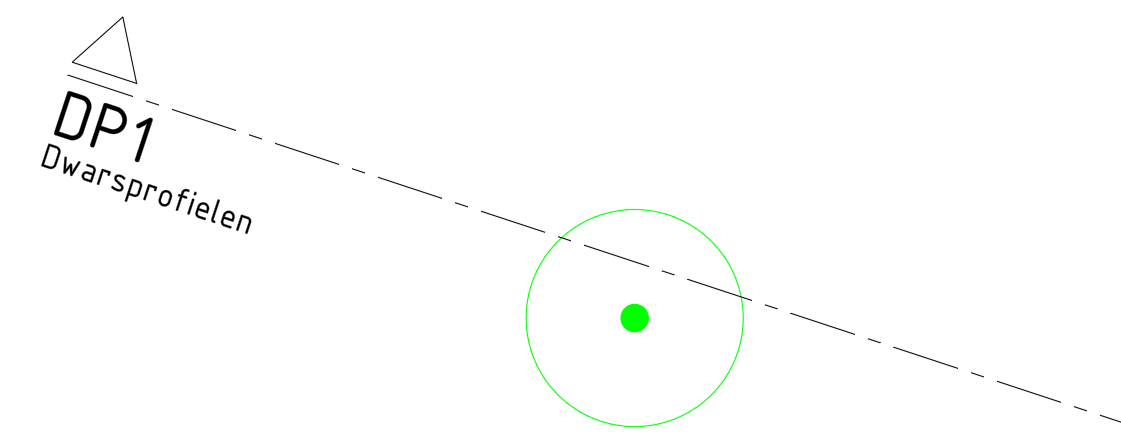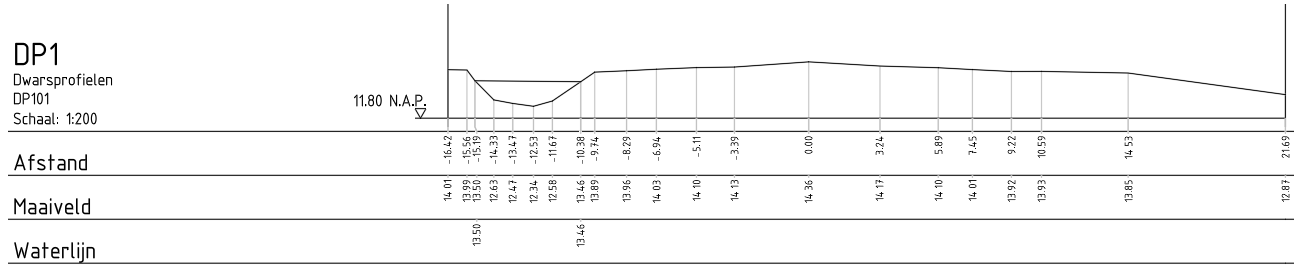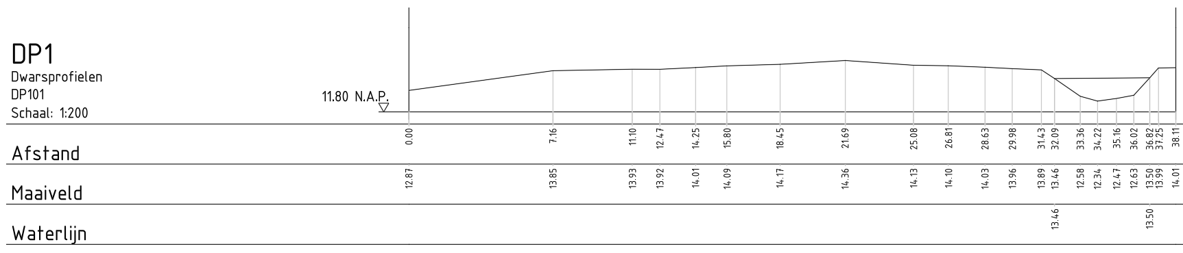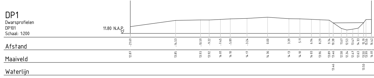 Hierbij is de stuurcode 'DP' voor een dwarsprofiel gebruikt, en is een lijn 'mv' in profiel 101 gemeten. Dit resulteert in het volgende zijaanzicht in AutoCAD: