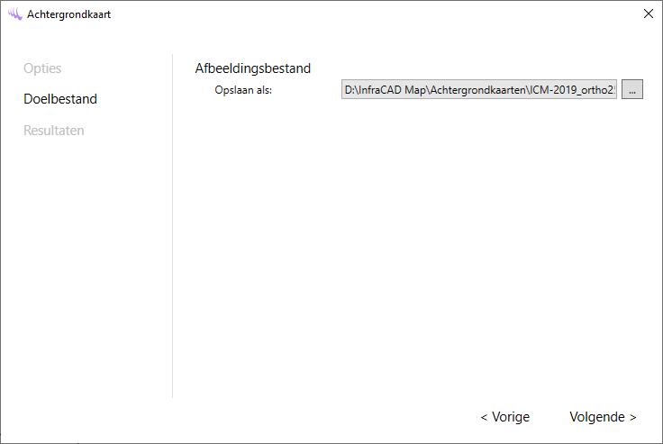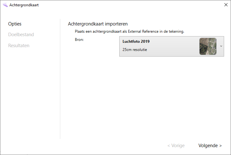Alle beschikbare bronnen kunnen worden gekozen in het keuzeveld. Een kleine preview aan de rechterzijde geeft een beeld van het eindresultaat. Voor alle bronnen behalve de luchtfoto is het mogelijk om de kwaliteit te kiezen. Voor een groot projectgebied kan een lagere kwaliteit worden gekozen.