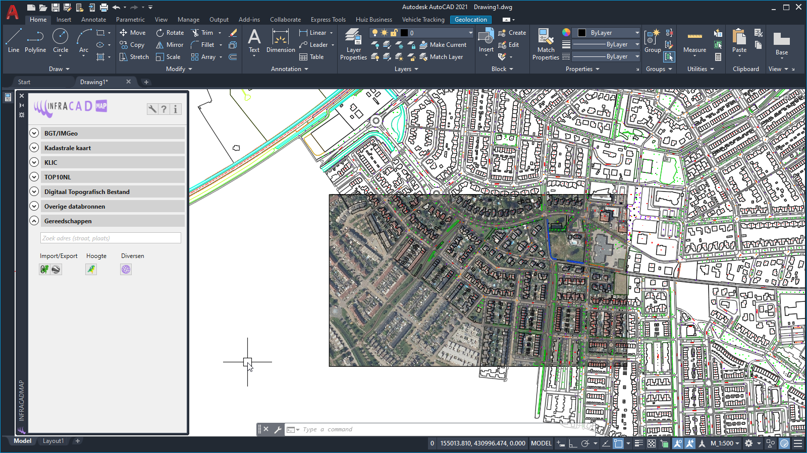 De achtergrondkaart wordt samengesteld uit losse tegels en na samenstelling als External Reference in de tekening geplaatst.