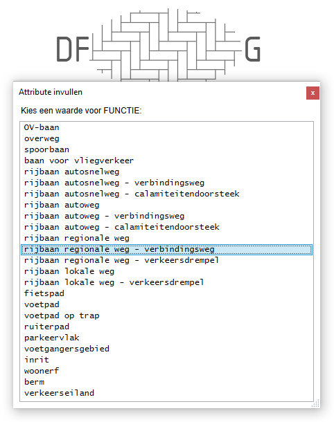 Dit scherm verschijnt alleen als het Symbool een Attribute “FUNCTIE” bevat, en alleen wanneer de Elementcode “Vlakvormend” (bij de 'Actieve instellingen') actief is: