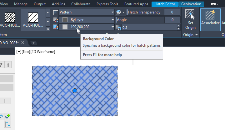 Deze lijst met Attributes voorzien van voorkeurswaarden wordt bewaard in de NLCS-bibliotheek en kan eenvoudig worden uitgebreid. Van reeds in de tekening geplaatste Symbolen kan de waarde worden gewijzigd met behulp van de functie 'NLCS Attributes wijzigen'. Achtergrondkleur De NLCS-module (in combinatie met de NLCS-bibliotheek) heeft zelf geen mogelijkheden om een achtergrondkleur aan een arcering toe te kennen. Het achteraf toekennen aan een geplaatste arcering kan eenvoudig met AutoCAD zelf: selecteer de betreffende arcering zodat het tabblad "Hatch Editor" in de Ribbon verschijnt. Kies bij Background Color de gewenste achtergrondkleur.