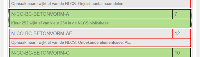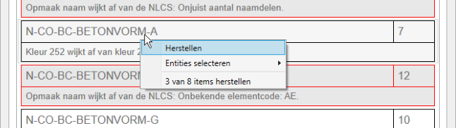 Het is ook mogelijk alle grijze items op een tabblad in één handeling automatisch te herstellen, kies dan in het voorgaande voorbeeld voor “3 van 8 items herstellen”. Rood omrande items kunnen niet automatisch worden hersteld. Met behulp van de InfraCAD NLCS-module is het mogelijk deze op andere wijzen alsnog snel te herstellen.
