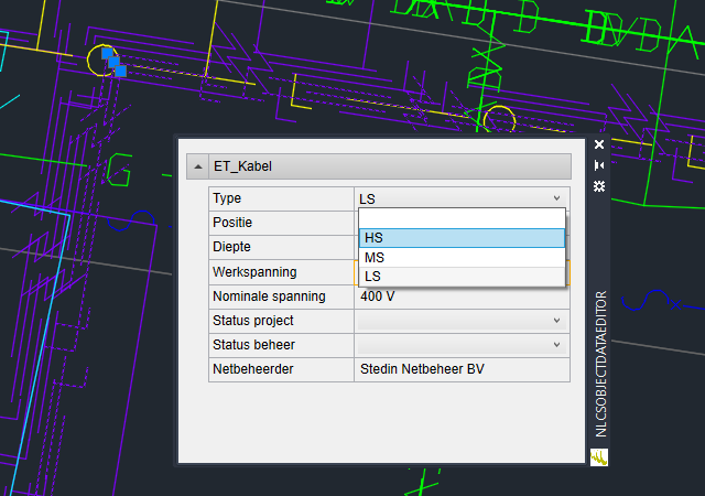 De kabels zijn direct van laag gewijzigd: •De nieuwe laag is weer gekoppeld aan het NLCS-object "KL >> ET" •De laagnaam is nu "B-WE-KL-ET_HS_400 V_STEDIN NETBEHEER BV-G" •Het dichtstbijzijnde NLCS-object in de NLCS-bibliotheek is "KL >> ET > HS", daarvan worden de eigenschappen toegepast