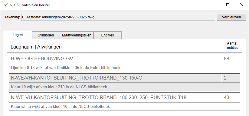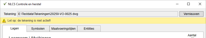 Alle afwijkingen worden per item gebundeld getoond. Om de impact van een afwijking te kunnen inschatten wordt het aantal Entities voor dit item ook weergegeven. De opmaak is hier identiek aan de pagina’s in het PDF bestand van het NLCS Controlerapport. Tabbladen Per type NLCS-element worden de afwijkingen op een eigen tabblad getoond. Zijn voor een type geen afwijkingen gevonden, dan wordt het betreffende tabblad weggelaten. In de voorgaande afbeelding zijn bijvoorbeeld de tabbladen ‘Arcering’ en ‘Tekststijlen’ niet aanwezig. Vernieuwen Op het ‘Controle en herstel’ scherm heeft u vele mogelijkheden om afwijkingen te herstellen. Herstelde items worden groen weergegeven, maar nog niet weggelaten. Wilt u de resultaten volledig vernieuwen, voer dan de controle opnieuw uit door op de [Vernieuwen] knop te drukken. Doe dit ook wanneer u een andere tekening wilt controleren. Als de bij “Tekening: “ aangegeven tekening niet actief is zal dit als volgt worden aangeduid: