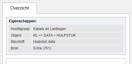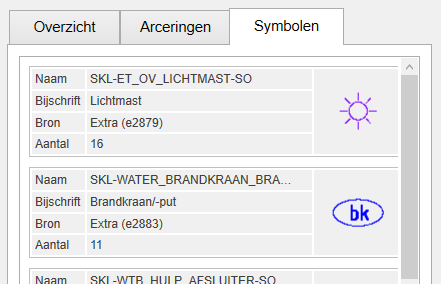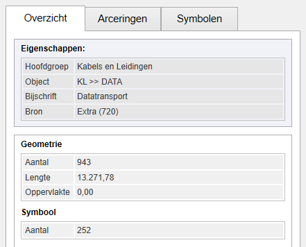 Op het tabblad "Overzicht" wordt nu onder de NLCS-eigenschappen ook een overzicht getoond van alle hoeveelheden die behoren bij het geselecteerde NLCS-object, met of zonder de onderliggende NLCS-objecten (zie "Onderliggende NLCS-objecten meetellen" bij de Instellingen). De tabbladen "Arceringen" en "Symbolen" tonen de bij het geselecteerde NLCS-object (en onderliggende NLCS-objecten) aanwezige Arceringen en Symbolen. Naast de NLCS eigenschappen worden hiervan ook het aantal (en bij Arceringen ook de oppervlakte) getoond.
