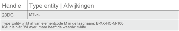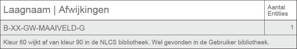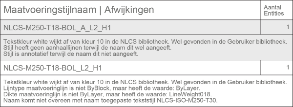 Voorbeeld opsomming van afwijkingen Alleen wanneer een afwijking wordt geconstateerd wordt het betreffende item gerapporteerd, met net voldoende informatie om de afwijkingen te verduidelijken. Om aan te geven wat de impact van een afwijking kan zijn in een tekening wordt bij een laag, arcering, symbool of stijl het aantal bijbehorende Entities vermeld.